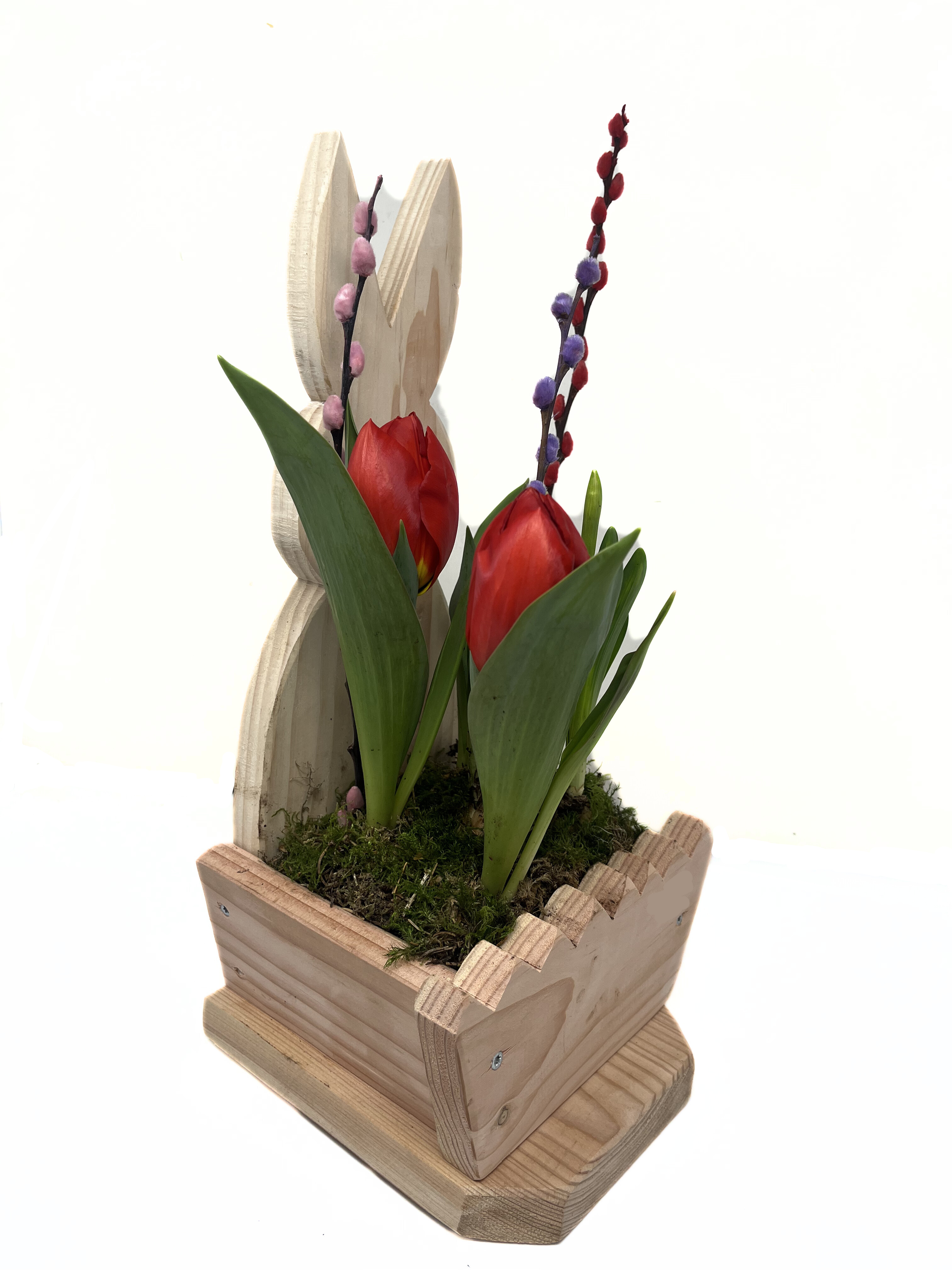 Dieses wunderschöne bepflanzte Osterarrangement fällt durch seine außergewöhnliche Schale auf. Die Holzschale mit integriertem Osterhasen wird in liebevoller Handarbeit von einem pensionierten Schreiner aus dem Sauerland hergestellt. Mit Öl eingerieben trotzt sie den Wetterbedingungen und ist auch viele weitere Jahre zu verwenden.